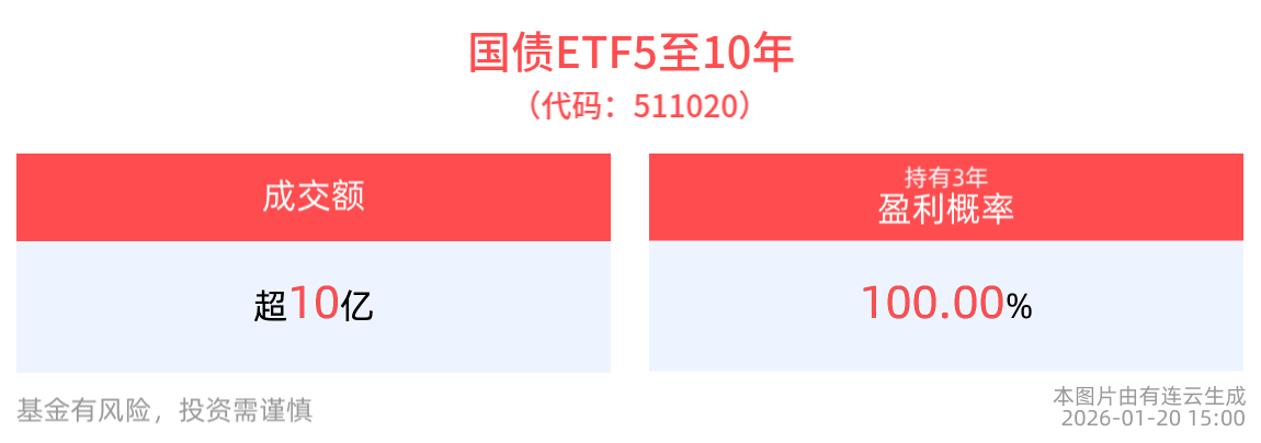 流动性方面,国债ETF5至10年盘中换手84.98%,成交10.85亿元,市场交投活跃。拉长时间看,截至1月20日,国债ETF5至10年近1周日均成交7.64亿元。