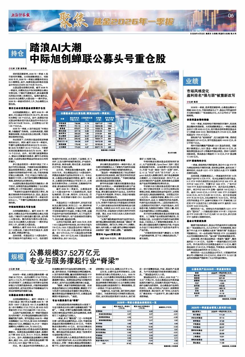 2026-04-24爱体育,爱体育官方网站,爱体育APP下载2026年一季度,受多重因素影响,公募基金整体亏损超2000亿元。市场风格变化之下,基金公司的盈利排名也暂时摆脱了“权益固收分化,大小公司对立”的传统格局。 权益类基金整体跑输 今年一季度,在结构性行情持续的环境中,权益类基金整体表现较弱。天相投顾数据显示,一季度公募基金合计亏损2029.42亿元,其中混合型和股票型基金合计亏损超2000亿元(混合型基金为372.98亿元,股票型基金为1704.44亿元)。 固收类产品“赶来救场”,但力度显然不够。债券型基金盈利537.49亿元,货币型基金盈利446.92亿元,合计不到千亿元。 海外市场的震荡严重拖累QDII基金的表现,同源统计数据显示,QDII基金一季度亏损983.18亿元,是除股票型基金以外亏损最多的基金类型。受益于金银的活跃表现,商品基金小幅盈利41.16亿元,FOF基金微亏2.85亿元。 ETF现结构性分化 一季度,受结构性行情的影响,部分中小盘ETF作为捕捉结构性行情的利器,受到资金青睐,盈利站到了榜单前列,而众多QDII-ETF及部分大盘ETF则聚集在榜单尾部。 具体来看,同源数据显示,一季度盈利排名前10的基金产品中有9只为ETF,仅天弘余额宝为货币基金。9只ETF中排名居前的分别是南方中证500 ETF、南方中证1000 ETF、华夏中证1000 ETF、广发中证1000 ETF及易方达创业板ETF,其后是天弘余额宝。其中,南方中证500 ETF是唯一盈利在100亿元以上的,盈利104.63亿元;3只中证1000 ETF分别盈利54.90亿元、39.73亿元和30.13亿元;易方达创业板ETF为20.78亿元,天弘余额宝为18.23亿元。排名其后的华安黄金ETF、国泰中证煤炭ETF、华泰柏瑞上证红利ETF以及易方达上证科创板50ETF盈利在13.03亿元至16.63亿元之间。 榜单的另一头,挂钩恒生科技指数的QDII-ETF成为“重灾区”,1只港股通互联网ETF和1只恒生科技ETF分别亏损175.47亿元和101.59亿元,多只证券ETF也跻身亏损榜单前列。 基金公司重新洗牌 随着市场风格变化,基金公司的盈利排名也暂时摆脱了“权益固收分化,大小公司对立”的传统格局,部分旗下中小盘ETF规模较大或者“踩准行情”的基金公司脱颖而出,而一众权益资产特别是ETF占比较高的大公司则落到榜单后排,“强与弱”的故事被重新改写。 具体来看,南方基金显然是一季度的“赢家”,整体盈利达111.34亿元,也是唯一一家盈利超过百亿元的公司。排名其后的兴证全球基金盈利57.13亿元,建信基金盈利37.29亿元,中银基金、华商基金、国寿安保基金和兴业基金盈利均在20亿元以上。 榜单的另一头以头部基金公司为主,亏损最多的两家公司亏损额均在378亿元左右,权益ETF与QDII基金的双重拖累严重影响了大公司的盈利情况。